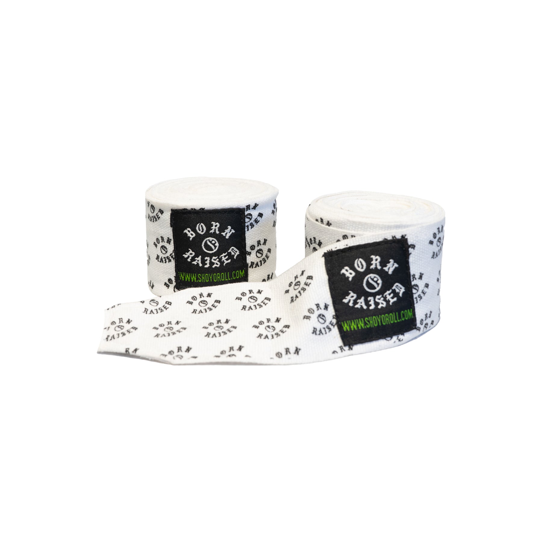 Traditional handwraps designed for training and sparring. Provides wrist support and knuckle protection under gloves. Secures with a hook-and-loop closure. Finished with collaborative Born X Raised × Shoyoroll branding.